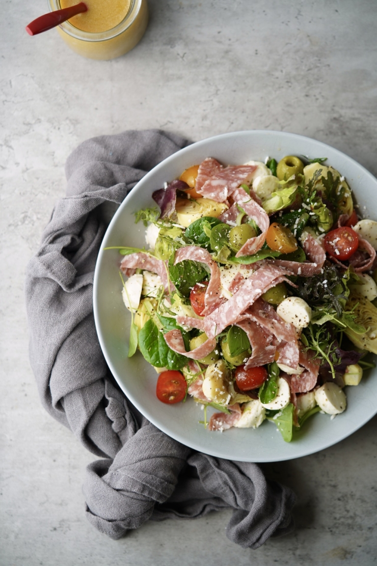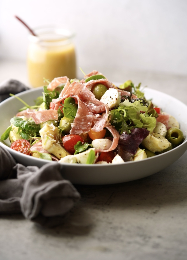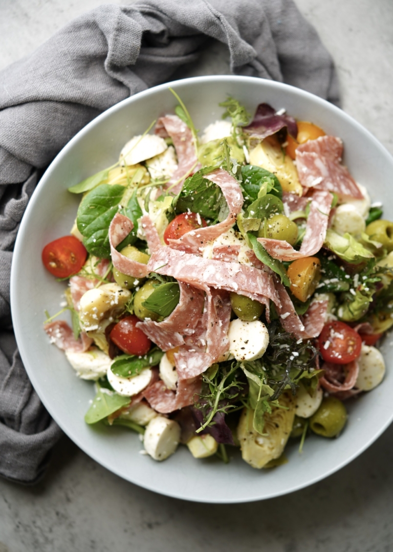 - For the Salad: In a large mixing bowl, combine the salami, lettuce, dill, olives, mozzarella, artichoke, tomatoes, and half the ricotta salata. Drizzle some vinaigrette on top and gently toss to coat. Transfer the antipasto salad to a large platter. Top with the remaining ricotta salata and additional drizzling of the dressing, and serve.