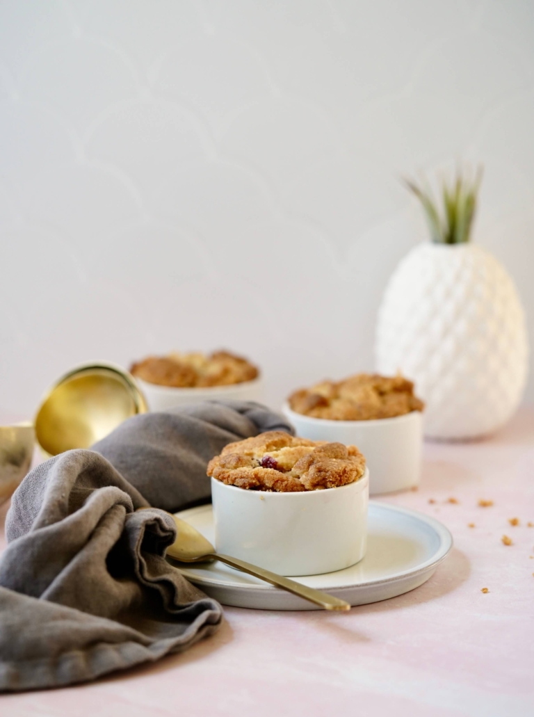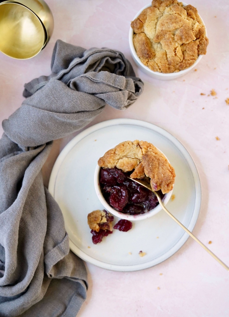 - For the Filling: In a medium mixing bowl, add the pitted cherries, sugar, lemon juice, vanilla extract, and flour, and toss well to coat. Divide the cherry mixture into the ramekins, packing the cherries down to flatten.
