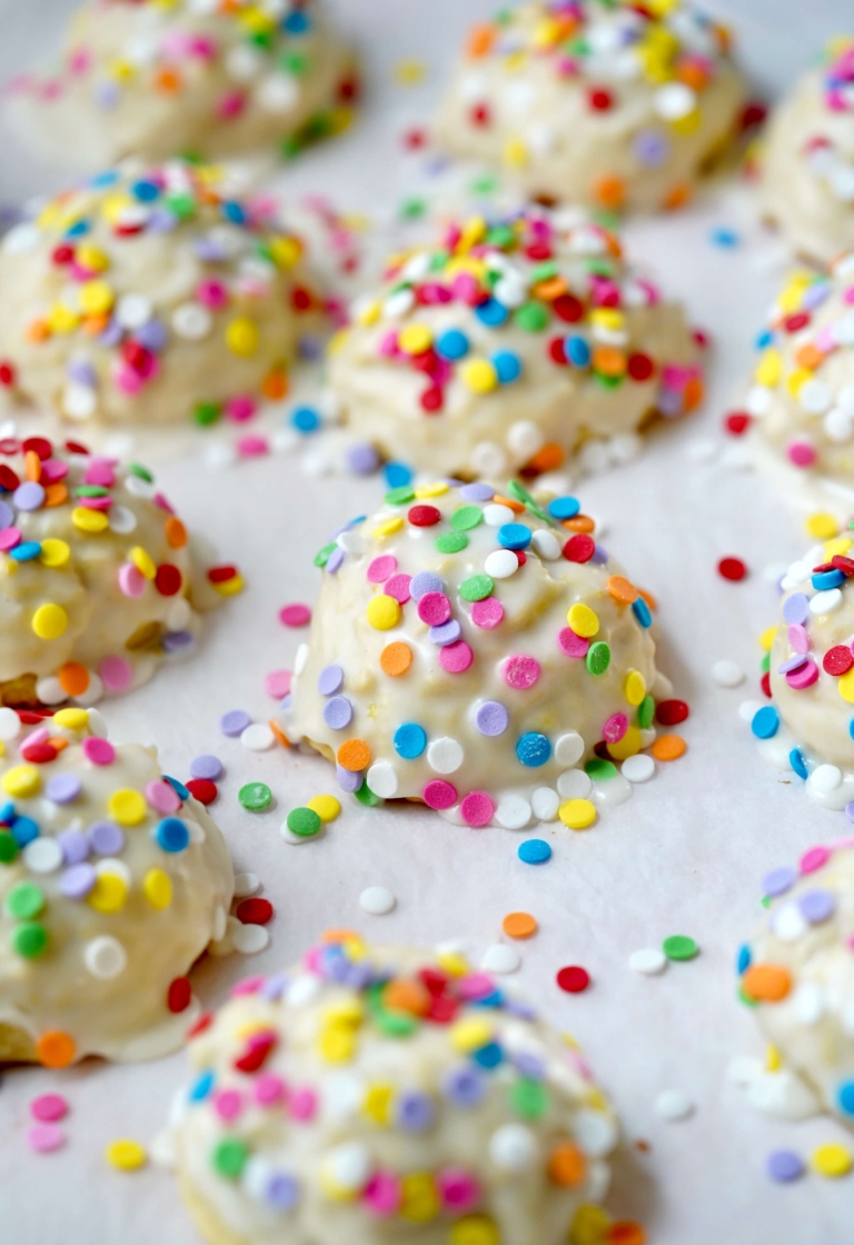 Once baked, the cookies are finished with a sweet lemony sugar glaze. While traditional versions lean toward soft pastel sprinkles on top in keeping with the Easter color palette, I prefer to go bold with bright colors, using colorful toppings that make them pop on the plate. They’re cheerful, crowd-pleasing any time of the year, and are just the kind of cookie that makes you smile before you even take a bite.