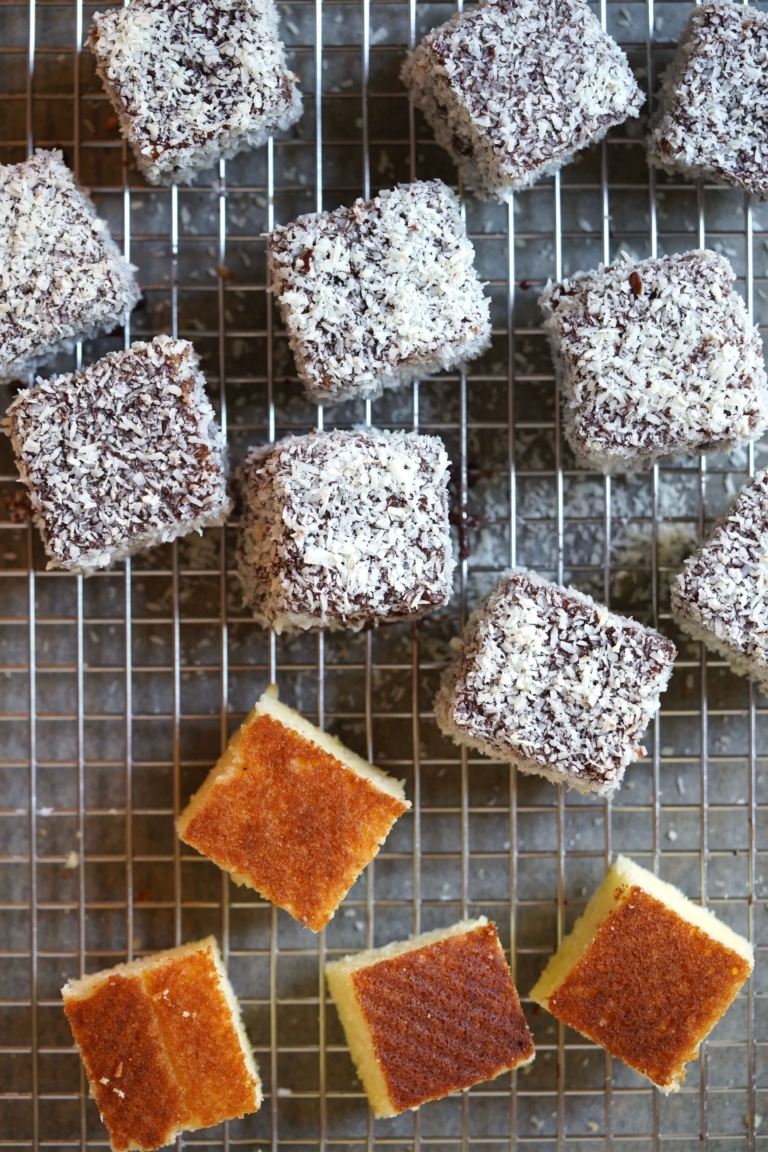 - Next, roll the chocolate-coated sponge in the coconut to cover completely. Place the coated lamington on a wire rack to dry. Repeat with the remaining cake pieces. If the chocolate becomes too thick, whisk in milk to thin it out.