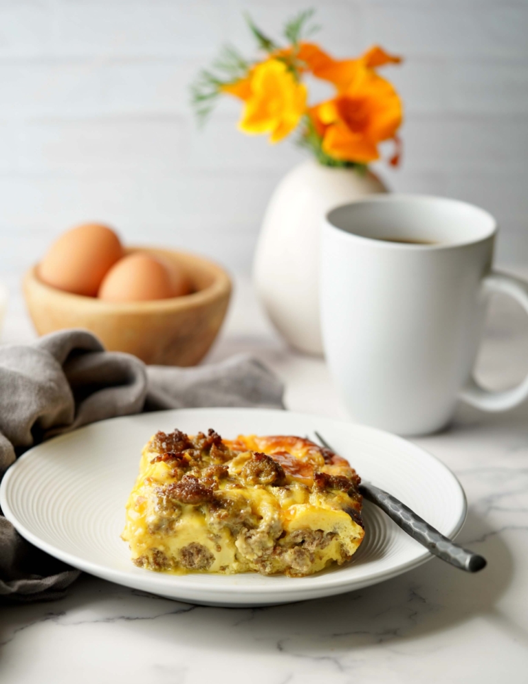 Overnight sausage and egg breakfast casserole (or strata, popularized in the 1984 Silver Palate Good Times Cookbook by Julee Rosso and Sheila Lukins) is the morning hero you didn’t know you needed in your life. Nothing beats the overnight breakfast casserole for an effortless, crowd-pleasing breakfast. It’s the dish that lets you do all the work the night before, then pop it in the oven while your coffee brews. Whether you’re feeding a full house over the holidays or just trying to simplify a sleepy Sunday morning, this casserole has your back.