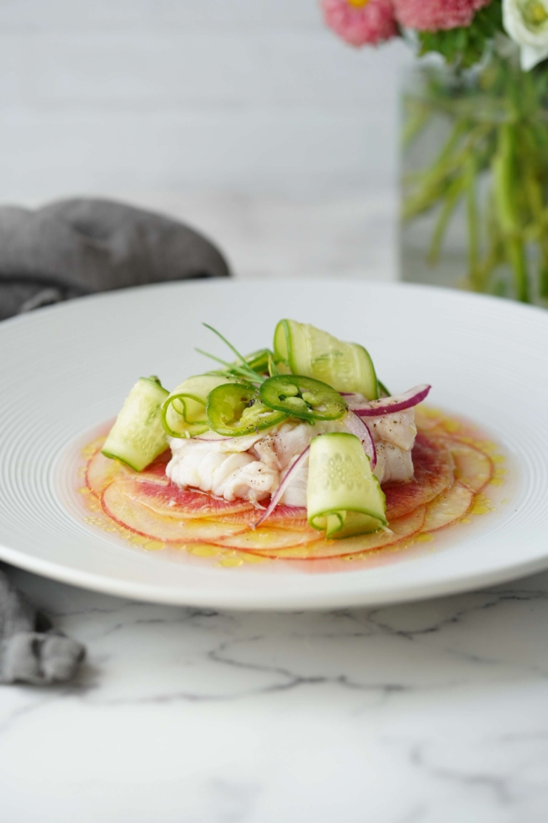 This snapper ceviche takes that heritage and adds a fresh, crisp layer of contrast. Thin slices of delicate snapper are bathed in a quick lemon-lime marinade that firms the flesh just enough while infusing it with a vibrant tang. But what makes it sing is the supporting cast: paper-thin Honeycrisp apple, watermelon radish, cucumber, red onion, and jalapeño—all bringing sweetness, spice, and crunch. A hint of horseradish adds subtle heat, and a drizzle of good extra-virgin olive oil ties everything together with smooth richness.