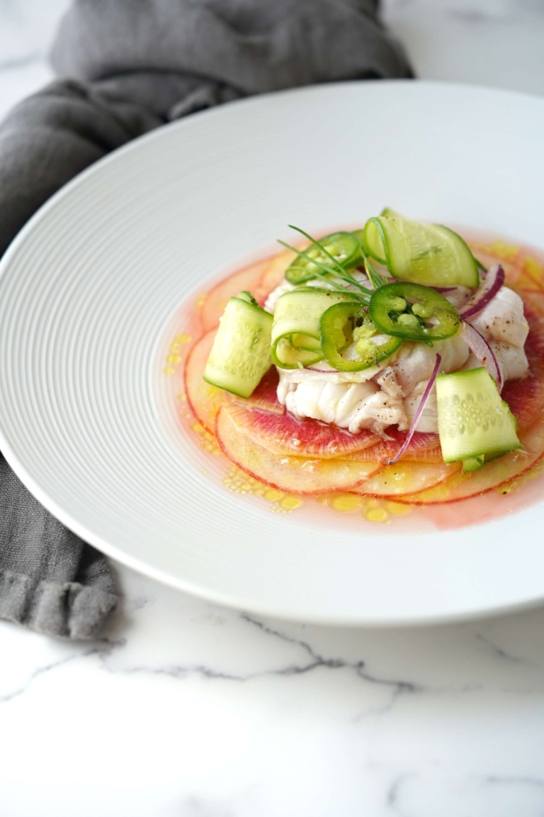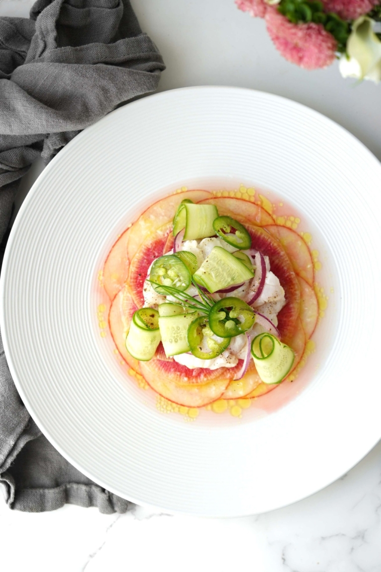 - Spoon a generous scoop of the snapper in the middle of the serving plate. Sprinkle the red onion, shaved cucumber, and jalapeño on top of the fish. Drizzle the citrus-olive oil mixture from the mixing bowl on top, followed by some freshly ground black pepper. Garnish with fresh chives and serve right away.