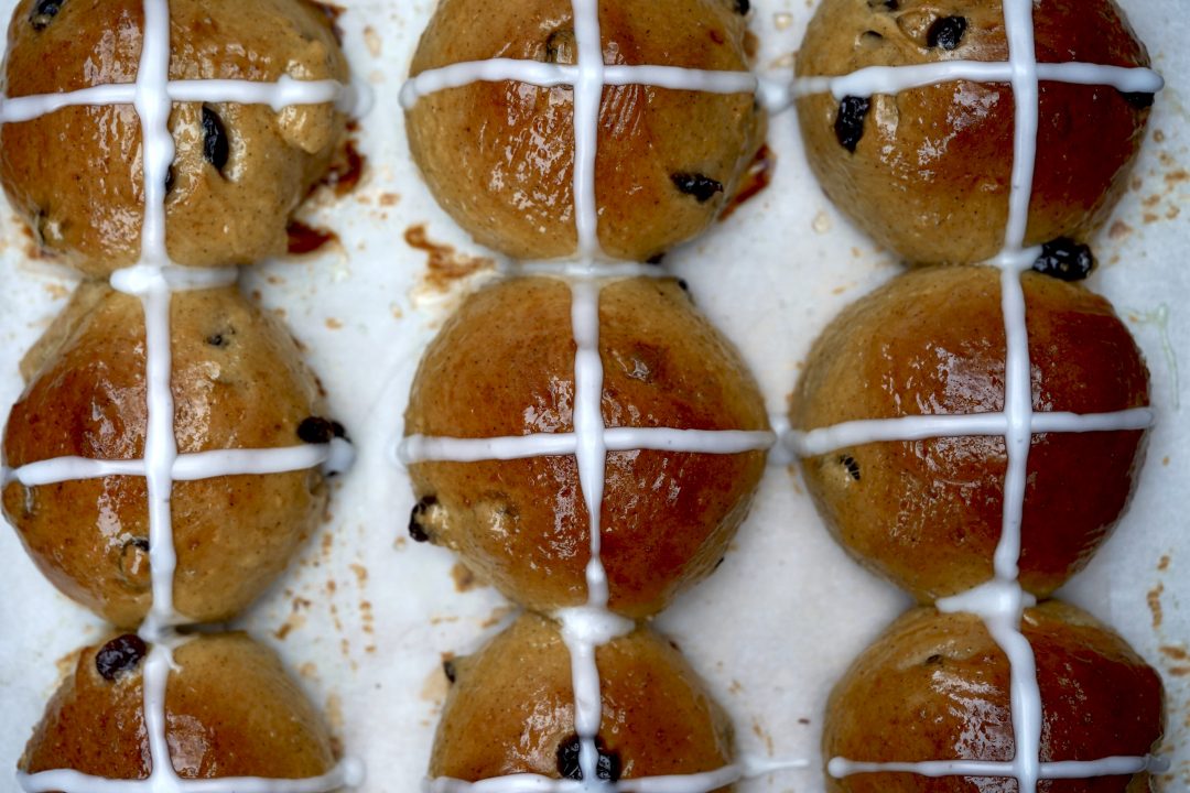 A hot cross bun is a yeasted sweet bun that is typically lightly spiced and studded with either raisins or currants. Their trademark, the well-known cross on top, is traditionally piped in icing or etched into the dough. These famous buns have been a holiday staple of many communities for centuries and are traditionally eaten in the United Kingdom, Ireland, Australia, New Zealand, South Africa, and some parts of the Americas on Good Friday. The hot cross bun itself marks the end of Lent and different parts of the bun have a certain meaning; including the cross representing the crucifixion of Jesus, and the spices inside signifying the spices used to embalm him at his burial.
