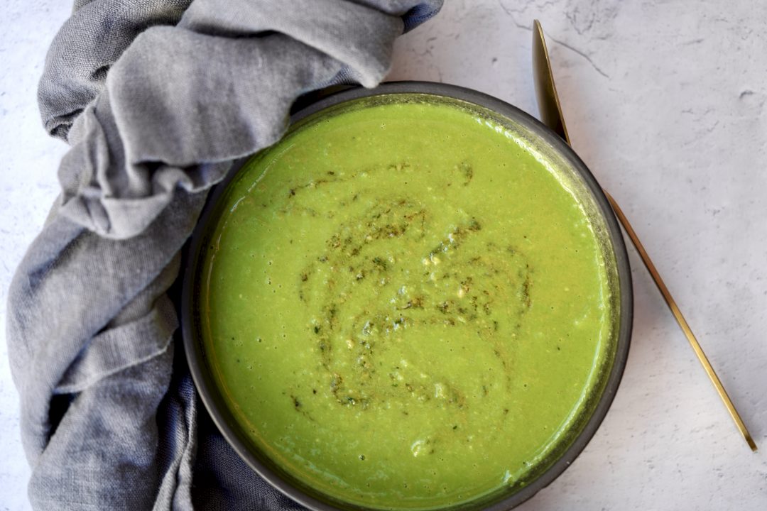 This sweet pea soup recipe could not be easier to make and is a lovely summer soup. This blended soup requires minimal cooking, and truthfully, it’s the pesto that takes more time to make. But don’t skip the pesto, it complements the earthy peas perfectly. The main pitiful you need to avoid when making this soup is cooking the peas themselves. Five minutes is all you need, that allow the peas to retain their beautiful, vibrant green hue, but if you’re reading a food blog, I think you can handle that.