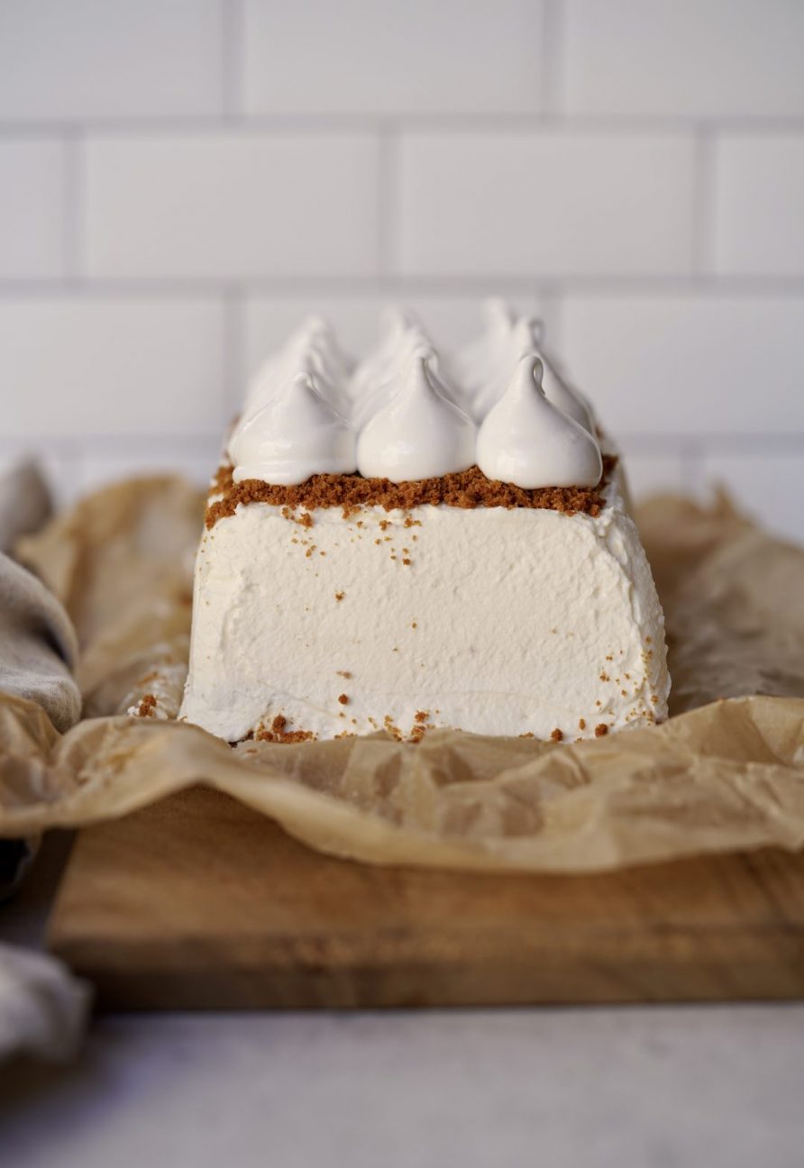 - To Serve: Invert the cake onto a serving platter. Using an offset spatula, add the extra cream to the sides of the cake and cover any cookies visible form the ends. Place the extra cookies in a small plastic bag and use a rolling pin to crush. Sprinkle the cookie crumbs on the top of the cake. Refrigerate the cake while you make the meringue topping.