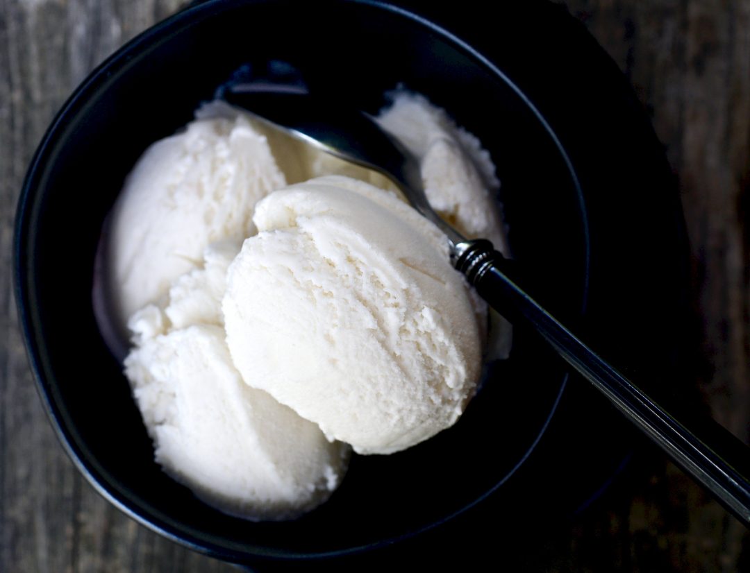 - Using a fine strainer, strain the mixture into a prepared ice cream maker and churn for about 45 minutes or until it's a nice soft serve consistence.