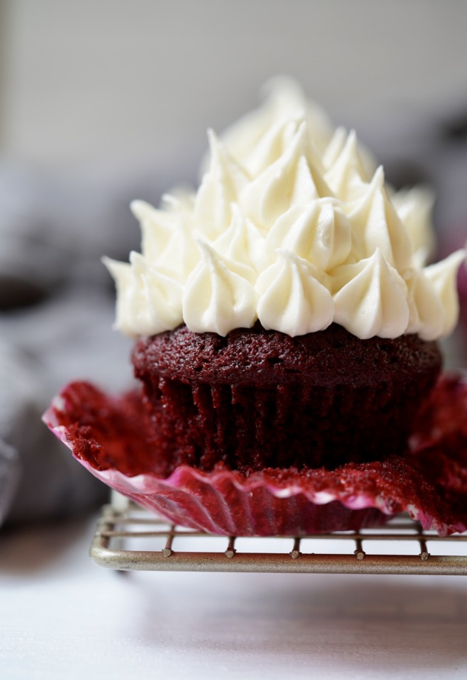 Red velvet cupcakes (or cakes) are traditionally red, crimson, or scarlet-colored colored cakes, with fluffy white ermine icing. And aside from my classic coconut layer cake, red velvet has become a recent obsession of my older son. The deep red hue of this popular flavor is visually striking and immediately draws attention. For my kid, it was love at first bite.