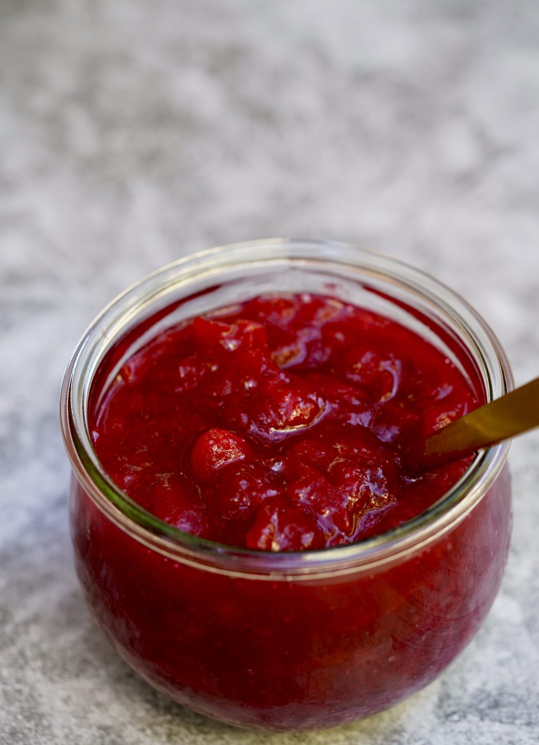 My recipe has just a few simple ingredients: fresh cranberries (do not use frozen or dried), orange juice, orange zest, sugar, water, and vanilla extract.  It takes about 20 minutes to make with some additional chilling time and you can make it days in advance.  I make my recipe a bit on the tart side, using about half as much sugar as most recipes, because that’s what I prefer. But you can easily adjust the sweetness level by increasing the amount of sugar to your liking so be sure to experiment a bit when making it.